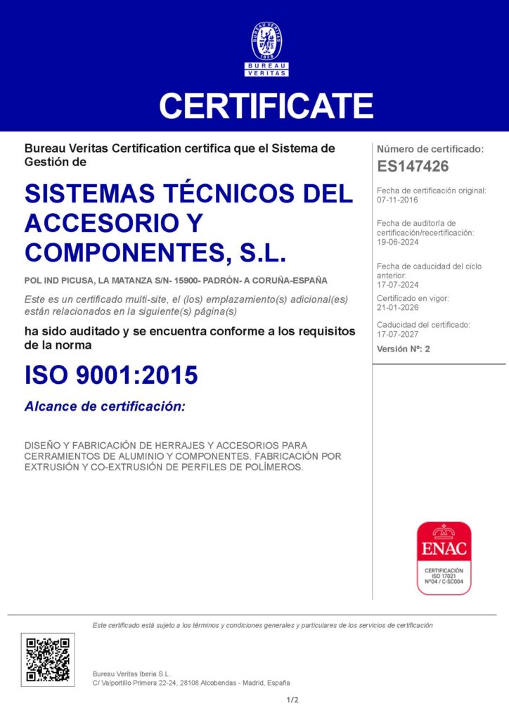 En STAC estamos certificados por Bureau Veritas en diseño y en fabricación de todos nuestros productos pero, para nosotros, la calidad no es una certificación, más bien, es una forma de actuar en todas las facetas de la empresa.